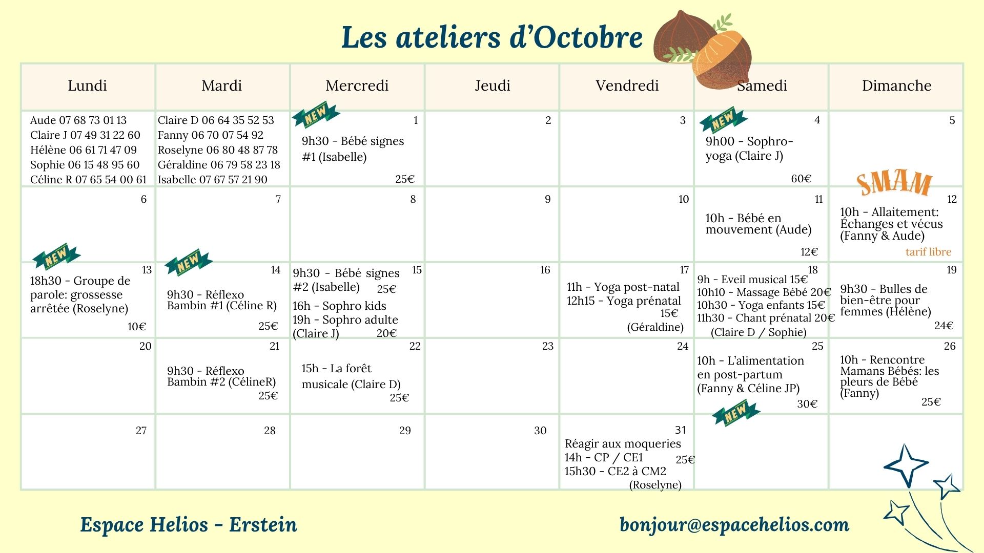 Les ateliers de l'Espace Helios Découvrez les ateliers et cours proposés par l'équipe de l'Espace Helios Recevez chaque mois le programme des ateliers Je m'inscris Le programme de Novembre (finalisé au 20 octobre) Retrouvez les portraits des différentes intervenantes Je découvre l'équipe