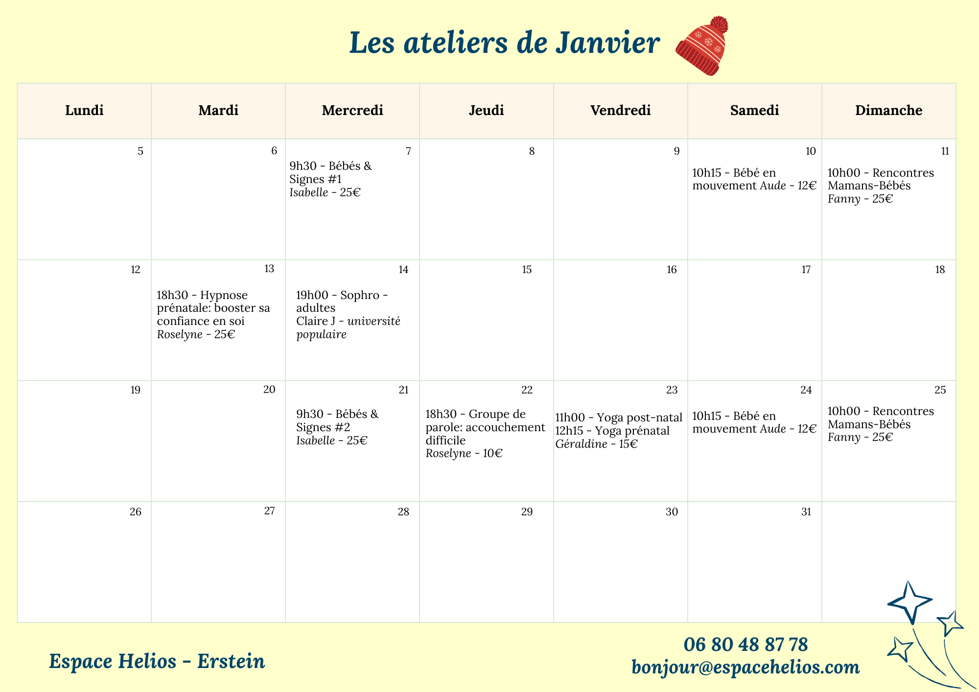 Les ateliers de l'Espace Helios Découvrez les ateliers et cours proposés par l'équipe de l'Espace Helios Recevez chaque mois le programme des ateliers Je m'inscris Le programme de Décembre (finalisé au 20 novembre) Retrouvez les portraits des différentes intervenantes Je découvre l'équipe