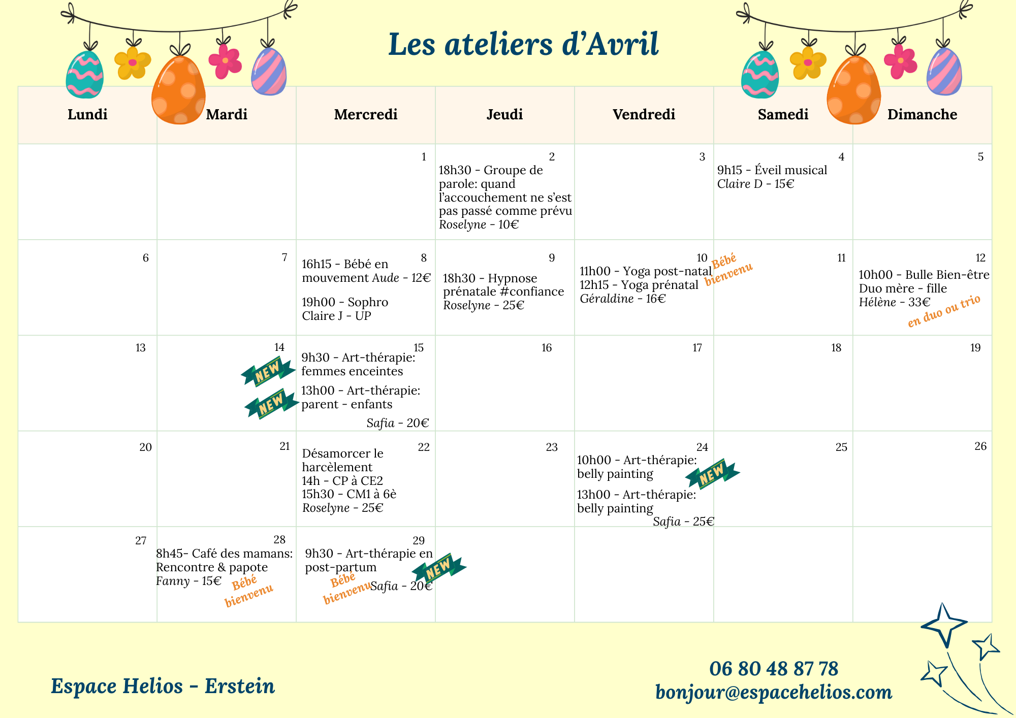 Les ateliers de l'Espace Helios Découvrez les ateliers et cours proposés par l'équipe de l'Espace Helios Recevez chaque mois le programme des ateliers Je m'inscris Le programme d’Avril (finalisé au 20 mars) Retrouvez les portraits des différentes intervenantes Je découvre l'équipe